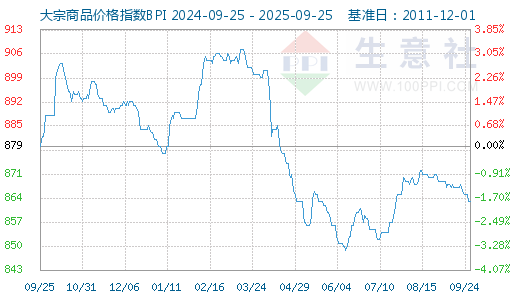 9月25日大宗商品价格指数BPI为863点,与昨日持平,较周期内最高点1343点(2021-10-19)下降了35.74%30.76%