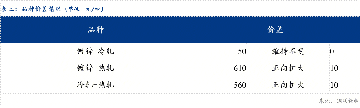 品种价差来看,现镀冷价差为50元/吨,较上一交易日维持不变;镀热价差为610元/吨,较上一交易日正向扩大10元/吨;冷热价差为560元/吨,较上一交易日正向扩大10元/吨。