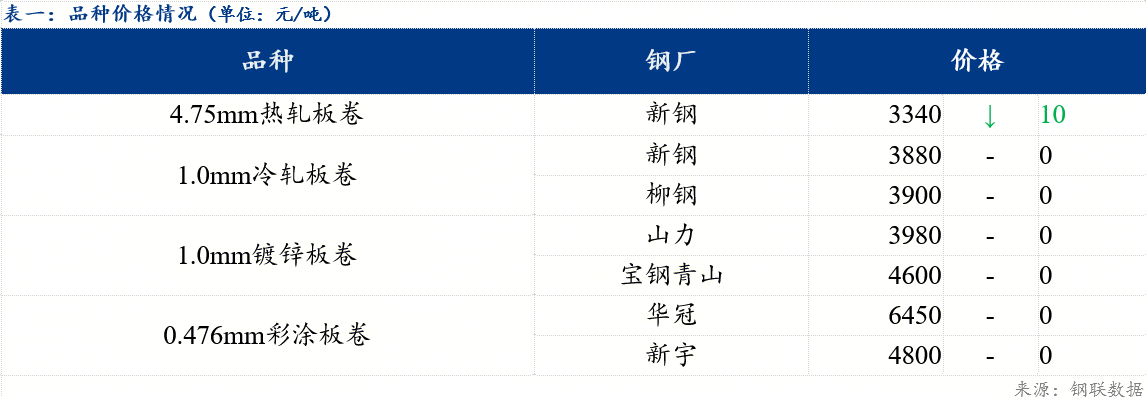 今日黑色系期货盘面震荡运行,原料热轧2601合约收盘价3313元/吨,较上一交易日跌幅1.22%,江西市场冷轧和镀锌板卷价格基本持平。截止收盘,新余热轧新钢4.75mm报价3350元/吨,较上一交易日下跌10元/吨;新余冷轧新钢1.0mm报价3880元/吨,较上一交易日暂稳;南昌镀锌山力兴冶1.0mm报价3980元/吨,较上一交易日暂稳,南昌彩涂天津新宇0.476mm报价4800元/吨,较上一交易日暂稳。