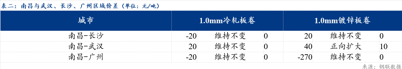 区域价差来看,冷轧品种,南昌-长沙现价差为-20元/吨,较上一交易日维持不变;南昌-武汉现价差为20元/吨,较上一交易日维持不变;南昌-广州现价差-20元/吨,较上一交易日维持不变。镀锌品种,南昌-长沙现价差20元/吨,较上一交易日维持不变;南昌-武汉现价差为40元/吨,较上一交易日正向扩大10元/吨;南昌-广州现价差为-270元/吨,较上一交易日维持不变。