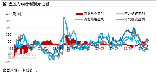 本周黑色产业链钢焦企业盈利空间均有收缩。周内焦煤价格维持偏强上涨,焦炭价格暂稳,焦化厂利润空间被挤压,多数焦企陷入微亏损状态。截至9月25日,河北地区捣固冶金焦平均盈利-42元/吨,较上周降11元/吨,较上月同期利润减少61元/吨。周内终端钢材产品价格整体震荡调整,整体成本偏强,钢厂整体盈利水平继续收缩。其中唐山地区螺纹钢继续亏损,钢坯、热卷盈利略有收缩。截至9月25日,河北唐山钢坯盈利63元/吨,环比减少15元/吨;螺纹钢本周盈利-63.1元/吨,增亏4元/吨;热卷盈利减少13.3元/吨至38.9元/吨,较上月盈利减少17.7元/吨。目前除钢坯外,多数钢材产品盈利较上月处于收缩状态。
