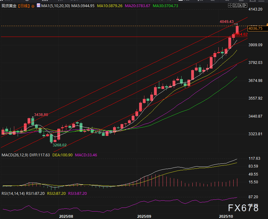 周三黄金价格持续站稳4000美元关口上方,这一走势代表最近3个交易日金价对上升通道的轨道进行了2次突破,同时也是这波上涨涨速最快的三个交易日,这种加速毫无疑问代表这里是金价近期的情绪高点,情绪高点都是获利了结的划算点位。