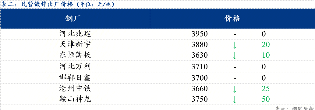 今日北方民营钢厂镀锌出厂指导价在3630-3950元/吨。