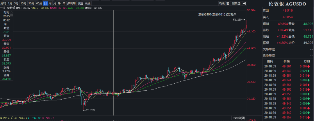 北京时间10月9日,伦敦现货白银突破50美元/盎司大关,一度站上51美元高位,创历史新高,但随后有所回调。10日下午,现货白银再次上攻,价格一度重回51美元/盎司关口上方。