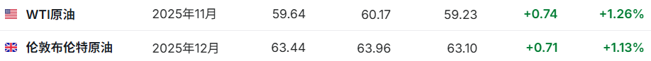 3. 截至发稿,WTI原油涨1.26%,报59.64美元/桶。布伦特原油涨1.13%,报63.44美元/桶。