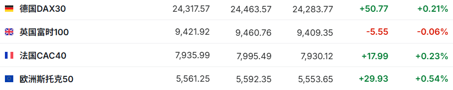 2. 截至发稿,德国DAX指数涨0.21%,英国富时100指数跌0.06%,法国CAC40指数涨0.23%,欧洲斯托克50指数涨0.54%。