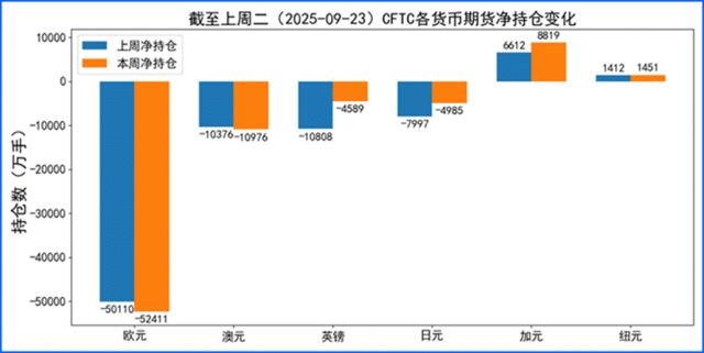 据美国商品期货委员会公布的2025-09-23期货市场头寸持仓报告显示,上周各货币的报告总持仓情况如下:欧元净空头变化2301手,澳元净空头变化600手,英镑净多头变化6219手,日元净多头变化3012手,加元净多头变化2207手,纽元净多头变化39手,上周没有总持仓多空转换的货币。除此之外,单向总持仓变动超过20%的货币有:加元。