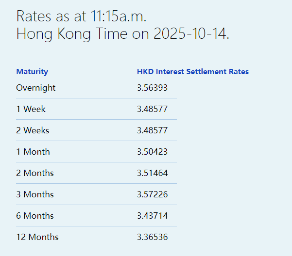 10月14日,港元拆息普遍上升,隔夜息报3.56393%,跌3.178基点;一周拆息升6.16基点,报3.48577%,两周则升6.256基点,报3.48577%。而与楼按相关的一个月拆息报3.50423%,升6.399基点,终止四连跌;反映银行资金成本的三个月拆息报3.57226%,升4.905基点。