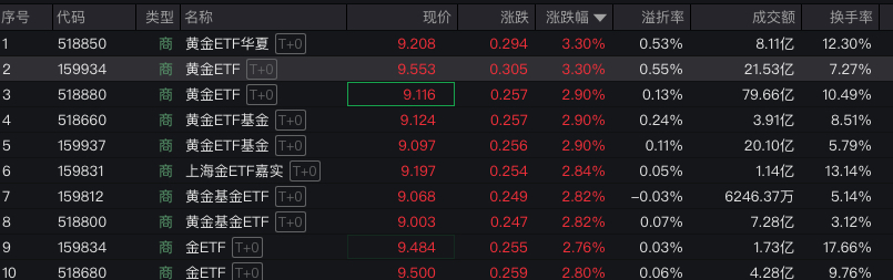 华夏(518850)涨3.30%,盘中涨幅一度达5.23%,黄金股ETF(159562)涨0.56%,盘中涨幅一度达4.23%,有色金属ETF基金