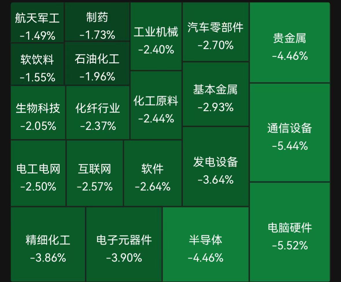 个股应声下跌;截至当日收盘,贵金属行业板块下跌4.46%,基本金属板块收跌2.93%,其中盛达资源下跌8.39%、洛阳钼业、兴业银锡跌超7%、江西铜业下跌6.81%、紫金矿业下跌5.75%、四川黄金、赤峰黄金等多只个股跌超4%。