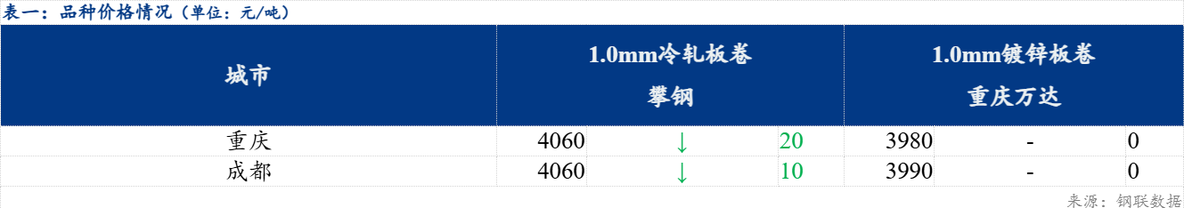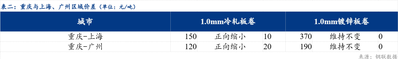 重庆、上海地区冷轧板卷区域价差缩小10元/吨;重庆、广州冷轧板卷区域价差缩小20元/吨。重庆、上海镀锌板卷区域价差维持不变;重庆、广州镀锌板卷区域价差维持不变。镀锌、冷轧品种价差反向缩小20元/吨;镀锌、热轧品种价差扩大10元/吨;冷轧、热轧品种价差缩小10元/吨。