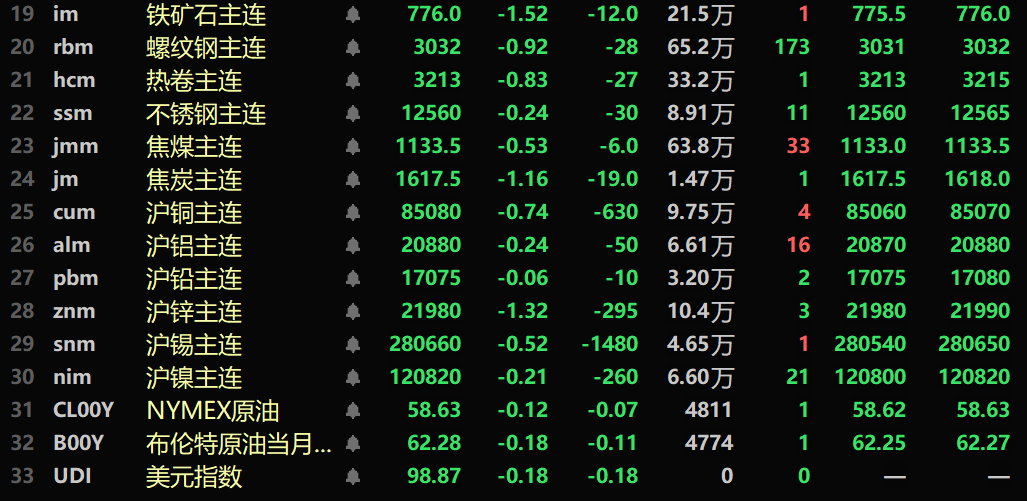 黑色系均飘绿,铁矿跌1.52%,螺纹跌0.92%,热卷跌0.83%,不锈钢跌0.24%。双焦方面:焦煤主力合约跌0.53%,焦炭主力合约跌1.16%。