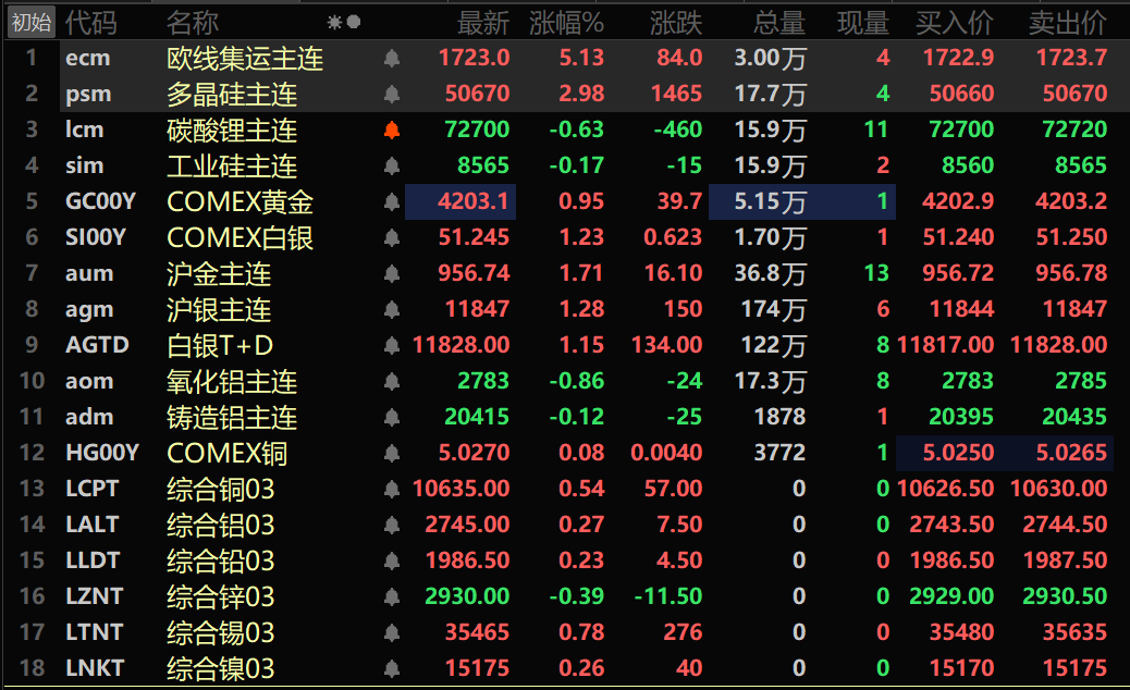 截至午间收盘,欧线集运主力合约涨5.13%,报1723点。