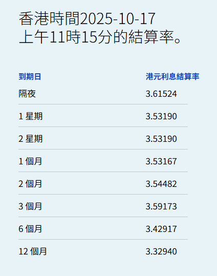 10月17日,港元拆息普遍向上,隔夜息报3.61524%,升19.107基点;一周拆息升13.19基点,报3.5319%,两周则升11.869基点,报3.5319%。与楼按相关的一个月拆息报3.53167%,升6.673基点。