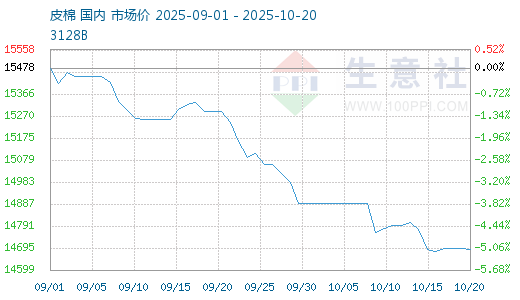 当前国内新棉采收进入高发期,北疆采收进度近8成,南疆约3成,供应端压力逐步加大;下游纺织企业补货积极性不高,市场购销不及预期。据生意社商品行情分析系统,截至10月20日3128B级皮棉现货价格在14689元/吨,周跌幅为0.79%。