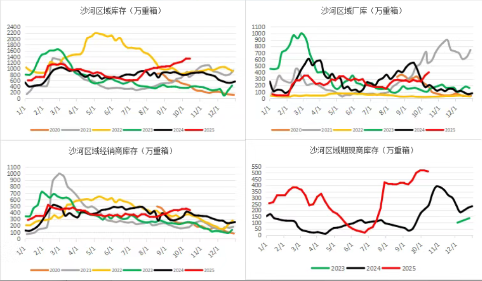 目前玻璃厂库节后再度重新累库,金九银十季节性需求持续走弱,没有表现出旺季特征,而期现商库存依旧维持很高的态势,分区域看部分地区库存压力依旧较大。