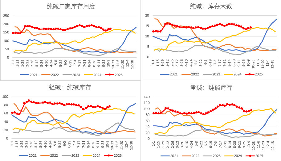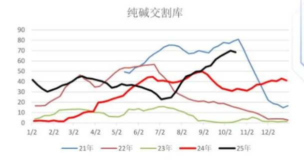 受限于产量持续偏高和下游补库告一段落,目前纯碱厂库再度累库,交割品重碱库存同比压力更大。近期随着下游和交割库库存处于高位后,厂家库存压力较大,价格也在持续走弱中。