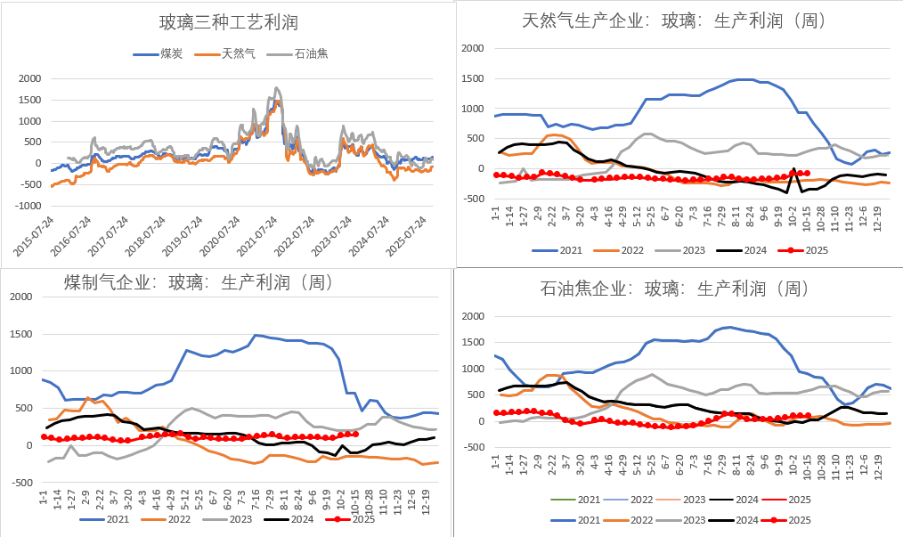 玻璃生产端,除了天然气工艺依旧亏钱外,煤制气和石油焦工艺也在小幅盈利阶段,利润相对平稳走弱状态,目前利润下玻璃厂生产偏稳定运行,冷修可能性偏低。