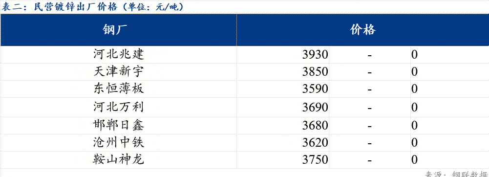 今日北方民营钢厂镀锌出厂指导价在3590-3930元/吨。