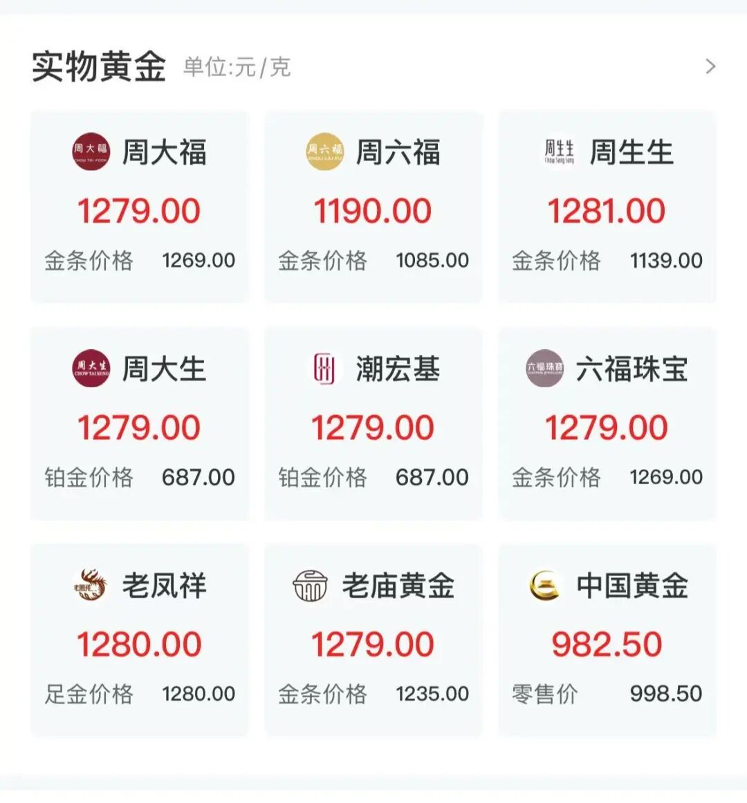 国内金饰方面,数据显示,周生生足金价格已上调至1281元/克,老庙黄金、周大福、潮宏基、六福珠宝等足金价格上调至1279元/克。此外,周大福、六福珠宝金条报价达1269元/克,与金饰足金报价仅差10元,老庙黄金金条价格也达1235元/克,而周生生等品牌金条报价也在1100元/克左右。