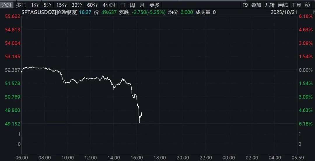 国际黄金、白银突然大跳水。截至发稿,现货白银暴跌超5%,此前现货白银于10月17日创下54.49美元/盎司的历史最高价。