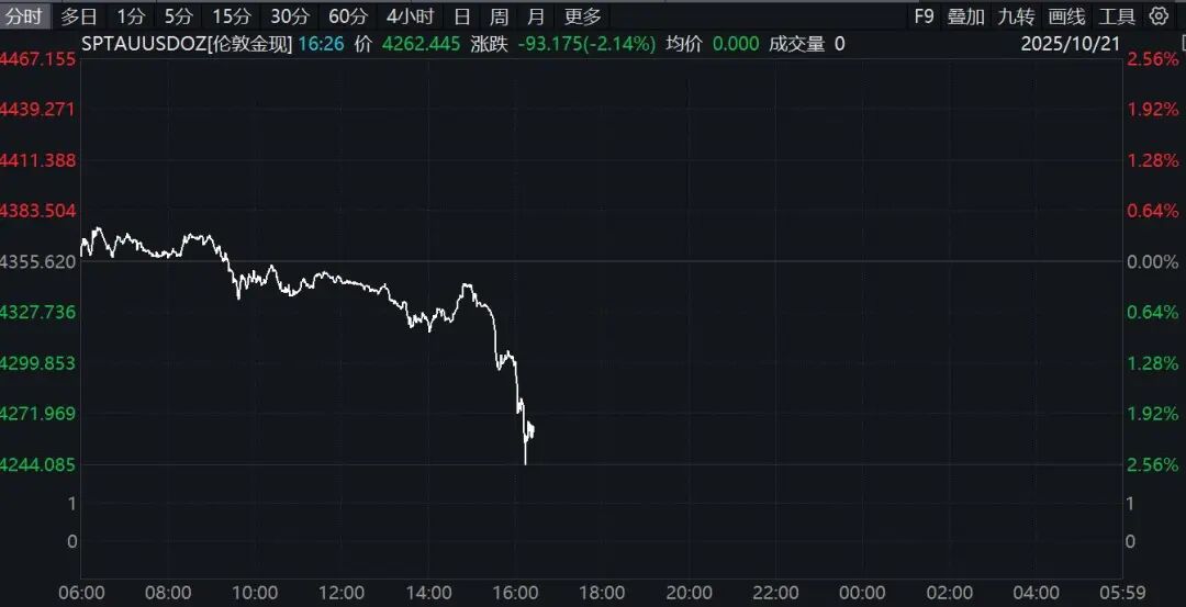 现货黄金跌逾2%,今早一度上涨。