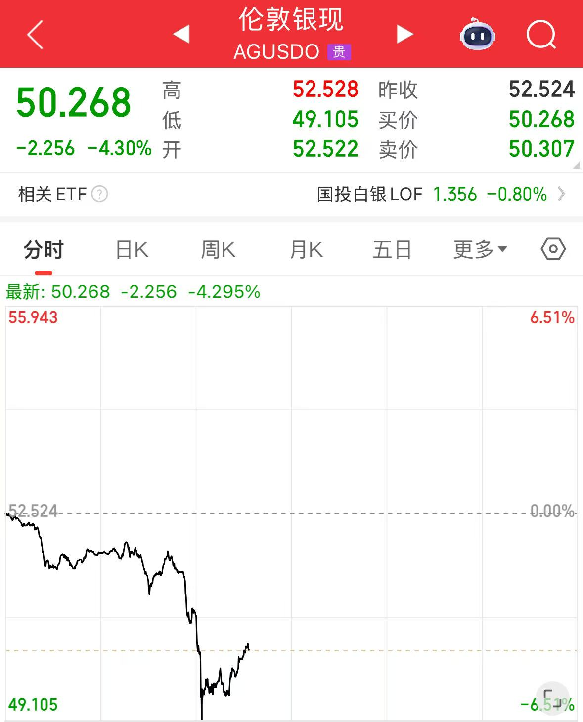 10月21日,国际贵金属价格跳水,现货黄金失守4300美元关口,日内跌超2%。现货白银跌破50美元/盎司,为10月10日以来首次,日内跌超5%。现货白银曾于10月17日创下54.49美元/盎司的历史最高价。截至发稿,伦敦金现报4256.82美元/盎司;伦敦银现报50.268美元/盎司。