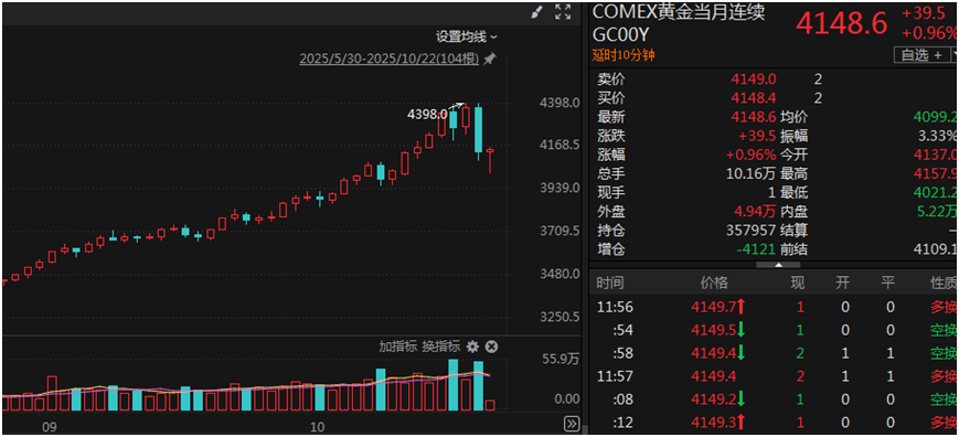截至10月22日发稿,COMEX黄金小幅上涨0.96%,达到4148.6美元/盎司。
