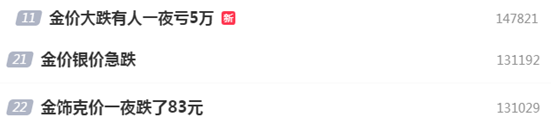 10月22日,“金价大跌有人一夜亏5万”的词条登上微博热搜,截至发稿,阅读量超过2000万次,排名热度榜第11。“金价银价急跌”“金饰克价一夜跌了83元”等也在当天成为热搜词条。