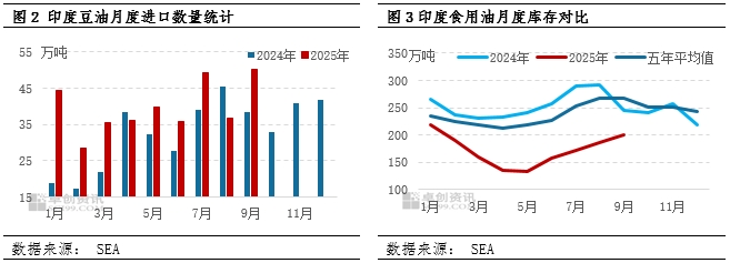 印度炼油协会(SEA)表示,由于精炼商转向采购更具价格优势的豆油,9月份棕榈油进口降至82.90万吨,环比下降16.3%,为5月份以来的最低水平;而豆油进口量增长36.8%,达到50.32万吨,创下2022年7月以来的最高水平;9月份食用油进口总量为160.46万吨,环比减少1%左右。库存方面,9月底印度食用油总库存回升至200.4万吨,连续第四个月回升,创下今年2月份以来的最高库存。虽然印度食用油库存在不断升高,但仍低于去年同期的245.4万吨,低于近五年平均库存266.65万吨。通过对比,可以看出当前印度食用油库存偏低,市场依然存在较大潜在需求,进而将继续增加对豆油的进口量。
