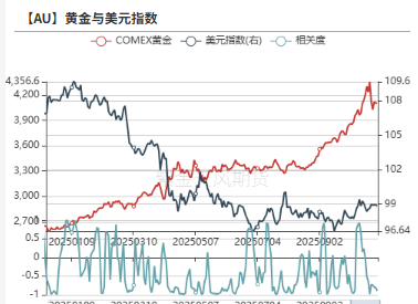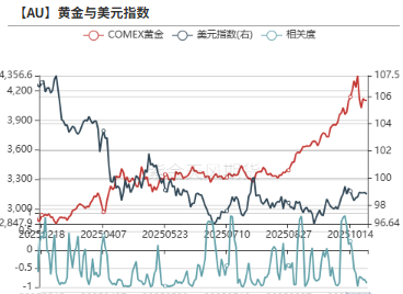 上周美元指数与黄金价格反向变动,黄金上周下跌3.29%,美元指数上涨0.39%至98.9,两者滚动相关性上升。