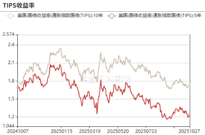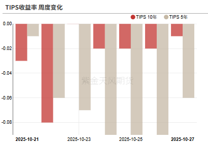 5年期和10年期TIPS收益率下行,5年期TIPS收益率收于1.24%,较前周下行6bps;10年期TIPS收益率收于1.73%,较前周下行1bp。