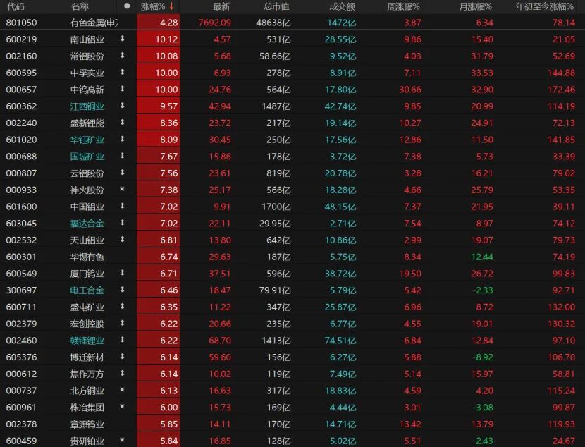 有色金属板块也是今天市场的“靓仔”,南山铝业、常铝股份、中孚实业、中钨高新涨停。