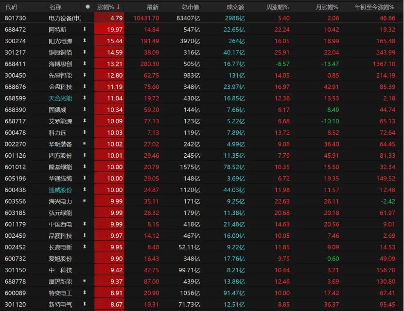 电力设备板块涨近5%,阿特斯“20cm”涨停,科力远、华明装备、四方股份、隆基绿能、华通线缆、通威股份等个股涨停。