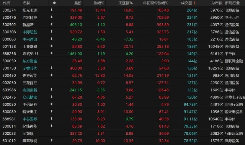 日成交额靠前的个股基本以科技股为主,且今日多数上涨。其中,阳光电源表现尤为突出,今日成交额高达264亿元,股价涨幅超过15%;胜宏科技涨近4%,工业富联涨幅超过9%。
