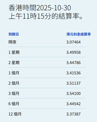 10月30日,港元拆息普遍向下,隔夜息报3.07464%,跌19.215基点;一周拆息跌5.286基点,报3.49958%,两周则跌2.726基点,报3.44786%。与楼按相关的一个月拆息连跌两日,报3.41536%,跌2.202基点。
