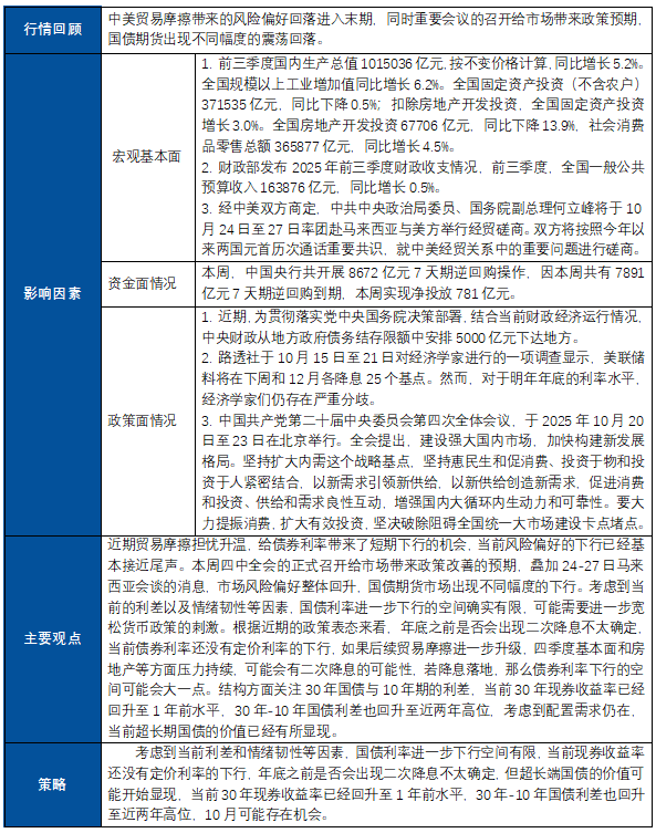主要观点:近期贸易摩擦担忧升温,给债券利率带来了短期下行的机会,当前风险偏好的下行已经基本接近尾声。本周四中全会的正式召开给市场带来政策改善的预期,叠加24-27日马来西亚会谈的消息,市场风险偏好整体回升,国债期货