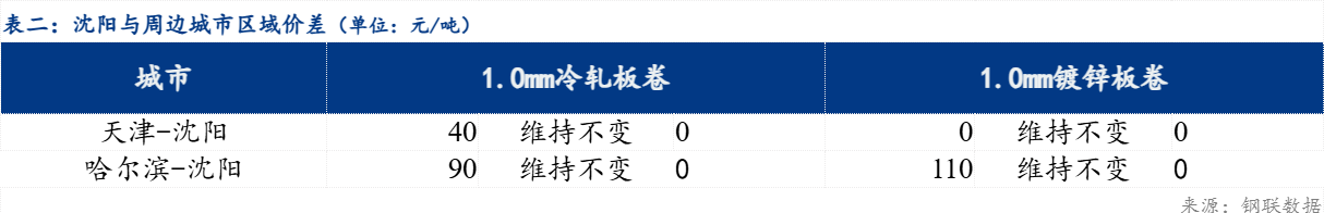 区域价差来看,天津-沈阳冷轧板卷区域价差维持不变,沈阳-哈尔滨冷轧板卷区域价差维持不变;天津-沈阳镀锌板卷区域价差维持不变,沈阳-哈尔滨镀锌板卷区域价差维持不变。品种价差来看,镀冷品种价差维持不变;镀热品种价差扩大10元/吨 ;冷热品种价差扩大10元/吨 。