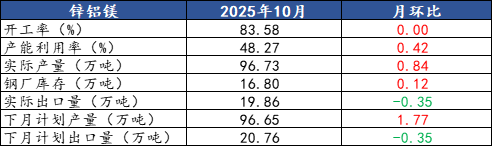 截止10月31日,Mysteel监测的全国重点锌铝镁生产企业中,本月开工率83.58%,月环比减少0.00%;钢厂月产能利用率48.27%,月环比增加0.42%;钢厂本月实际产量96.73万吨,月环比增加0.84万吨;钢厂库存16.80万吨,月环比增加0.12万吨;本月实际出口量19.86万吨,月环比减少0.35万吨;下月计划产量96.65万吨,月环比增加1.77万吨;下月计划出口量20.76万吨,月环比减少0.35万吨。