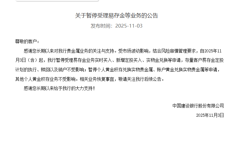 也发布公告,自11月3日(含)起,建行暂停受理易存金业务实时买入、新增定投买入、实物金兑换等申请,存量客户易存金定投计划的执行、赎回以及销户不受影响;暂停个人黄金积存兑换实物贵金属、账户黄金兑换实物贵金属等申请,其他个人黄金积存业务不受影响。