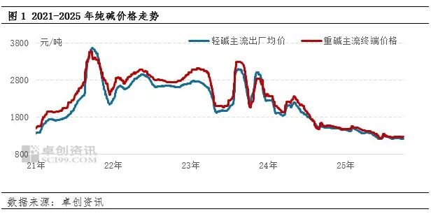 2025年纯碱价格打破季节性波动规律,成交重心不断下移,处于近五年低位。受各自需求影响,轻重碱价差持续收窄。