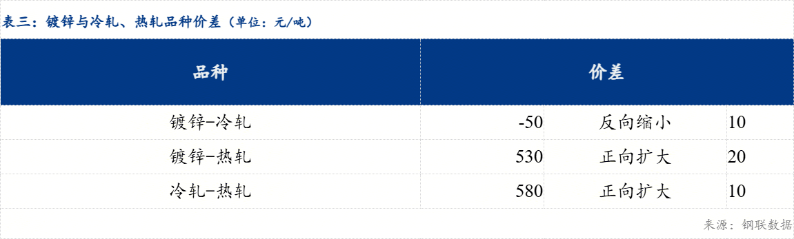 重庆、上海地区冷轧板卷区域价差维持不变0元/吨;重庆、广州冷轧板卷区域价差维持不变0元/吨。重庆、上海镀锌板卷区域价差正向扩大10元/吨;重庆、广州镀锌板卷区域价差正向扩大20元/吨。镀锌、冷轧品种价差反向缩小10元/吨;镀锌、热轧品种价差正向扩大20元/吨;冷轧、热轧品种价差正向扩大10元/吨。