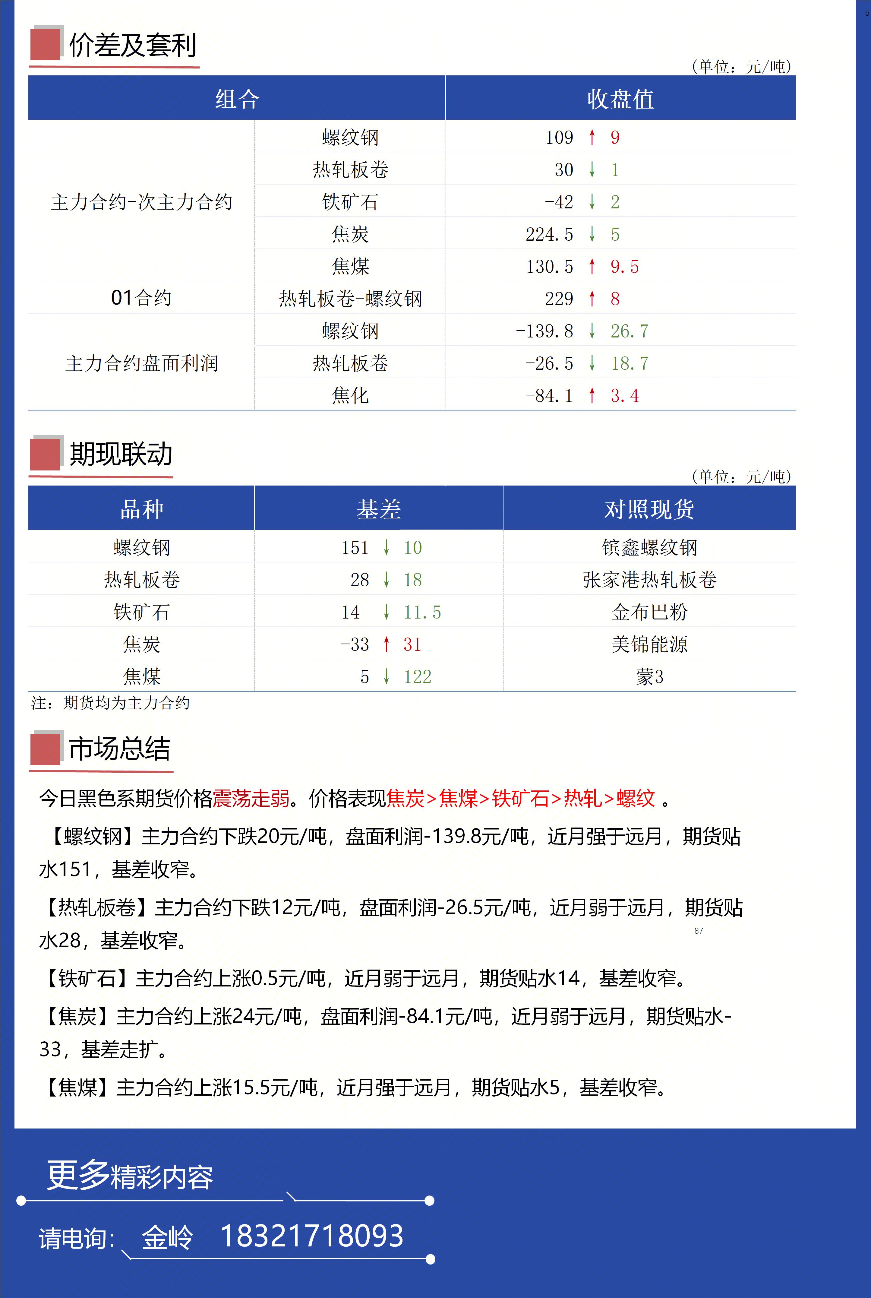 价格震荡走弱。价格表现焦炭>焦煤>铁矿石>热轧>螺纹 。