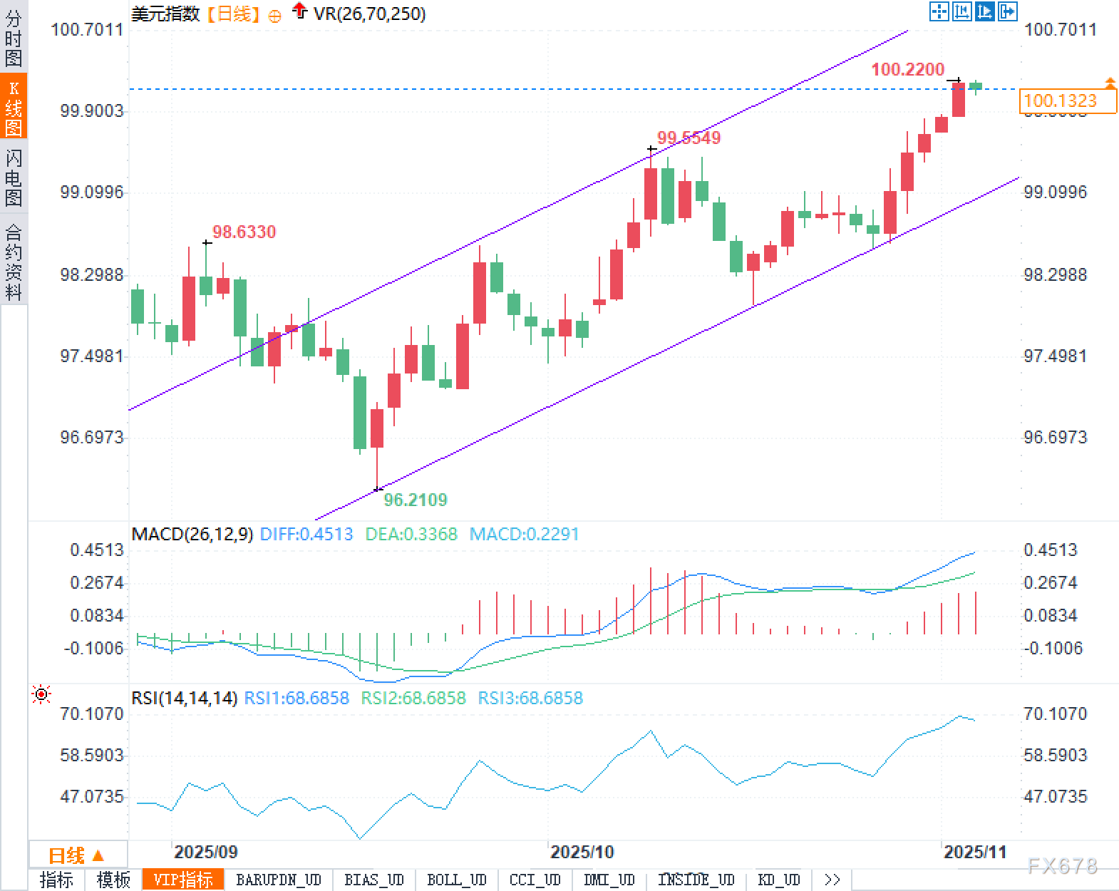 日线图显示,美元指数沿上升通道稳步抬升,通道下轨自低点96.2109上移,阶段性高点先后在98.6330、99.5549与100.2200处形成,结构完整、斜率均衡。当前价格逼近上沿100.2200,属于“阻力附近的强势盘桓”。MACD指标中,DIFF为0.4513、DEA为0.3368,柱状图为0.2291并呈扩张态势,说明趋势动能仍在累积;RSI(14)读数约68.6858,临近70的超买阈值,提示上攻同时伴随短线过热。
