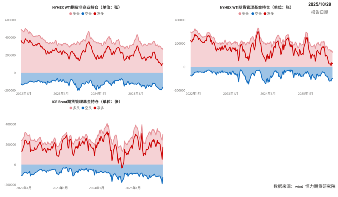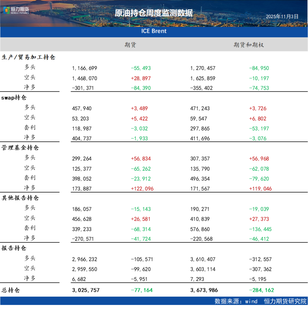 根据最新的数据,上一报告期Brent多头/空头/净多持仓变动+56968/-62078/+119046张。本周油价先涨后跌,Brent多头持仓增加而空头持仓减少,净多持仓大幅回升,资金情绪触底反弹