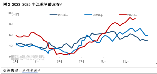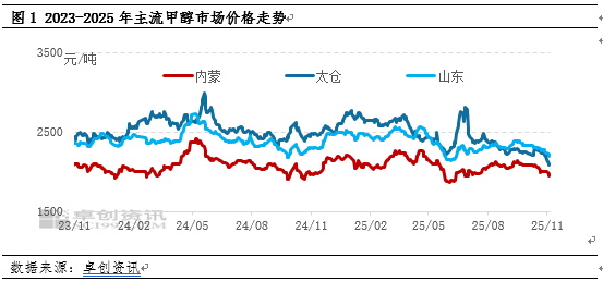 2025年1-10月,太仓市场均价在2249元/吨,较2024年均价2562元/吨下降12.22%。至2025年11月初,沿海地区甲醇现货价格已跌破2100元/吨,来到近两年的新低位置。