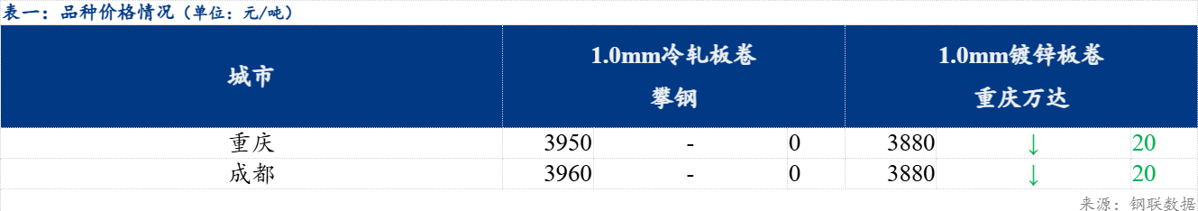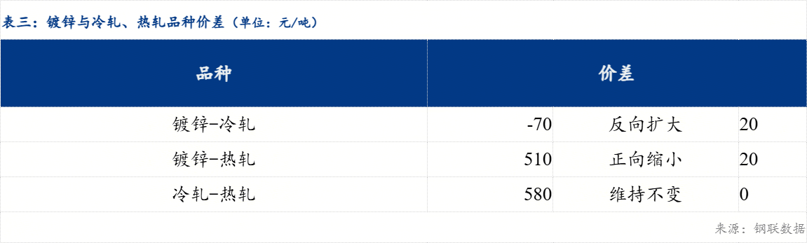 重庆、上海地区冷轧板卷区域价差维持不变0元/吨;重庆、广州冷轧板卷区域价差维持不变0元/吨。重庆、上海镀锌板卷区域价差维持不变0元/吨;重庆、广州镀锌板卷区域价差维持不变0元/吨。镀锌、冷轧品种价差反向扩大20元/吨;镀锌、热轧品种价差正向缩小20元/吨;冷轧、热轧品种价差维持不变0元/吨。