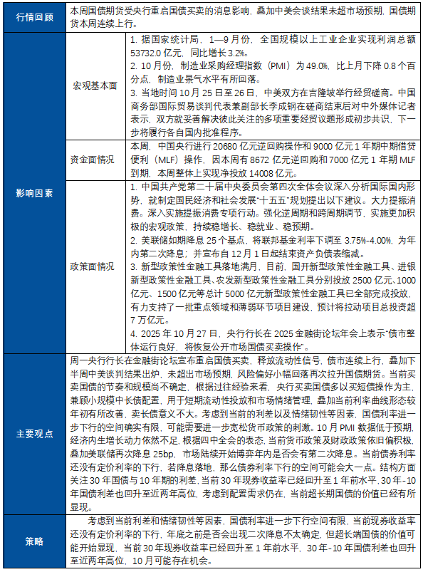 主要观点:周一央行行长在金融街论坛宣布重启国债买卖,释放流动性信号,债市连续上行,叠加下半周中美谈判结果出炉,未超出市场预期,风险偏好小幅回落再次拉升国债期货