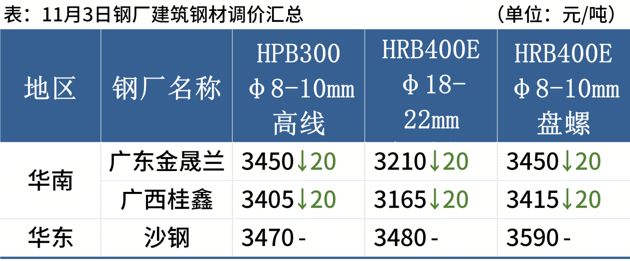 11月3日,2家钢厂下调建筑钢材出厂价20元/吨。