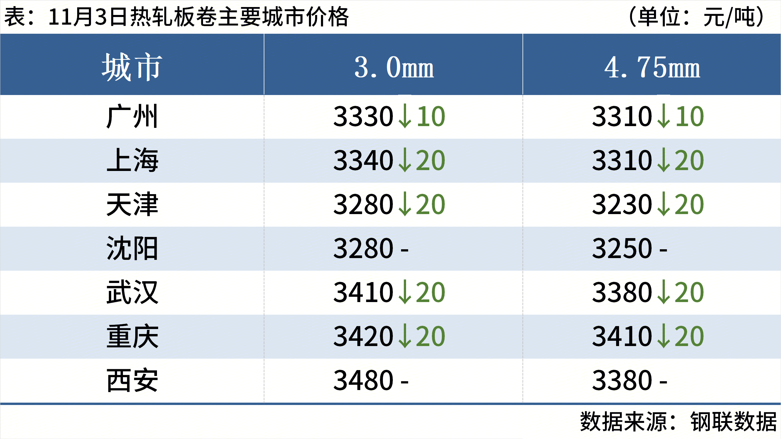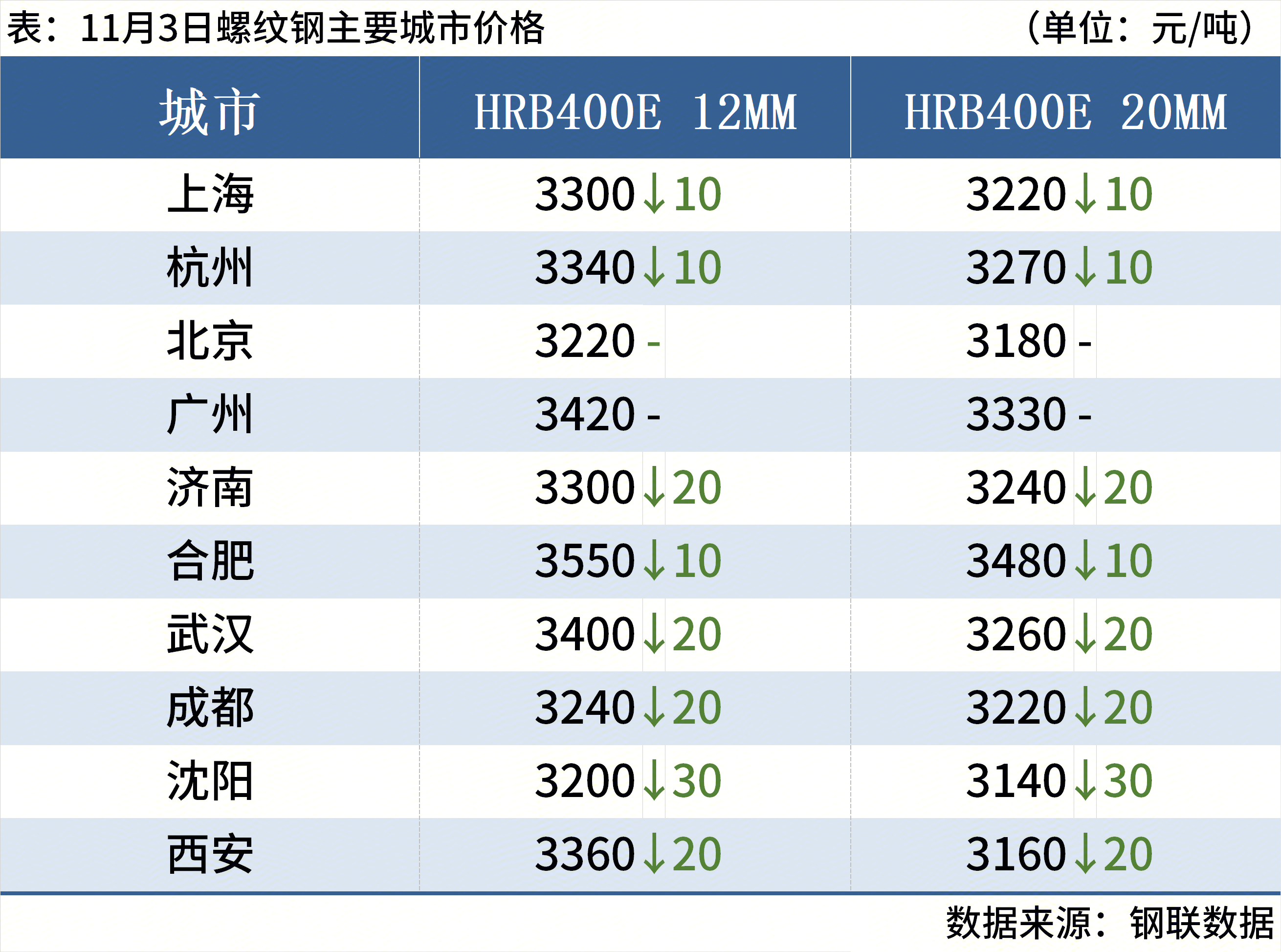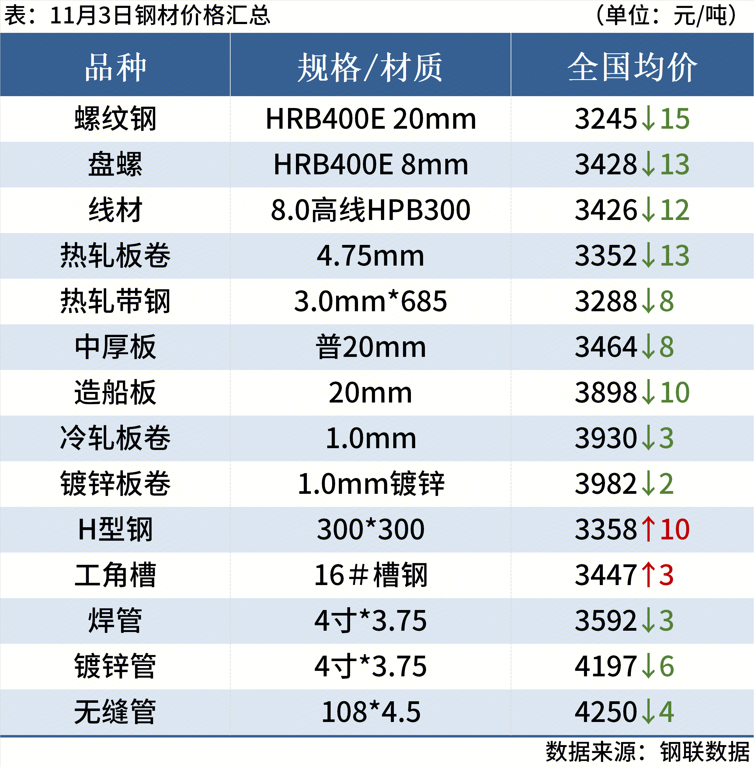 11月3日,国内钢材市场价格弱势下跌,唐山迁安松汀普方坯出厂含税价跌10报2960元/吨。期螺震荡走弱,国内现货市场价格多数趋弱,成交低迷,交投冷清。